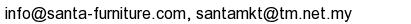 Company Particular| Company : | Santa Marketing Sdn Bhd | | Fax : | 607-3886991 | | Address : | No.10 Jalan Permas 9/6, Bandar Baru Permas Jaya, 81750 Masai Johor. Malaysia | | Email : |  | | Website : | http://santa-furniture.com |