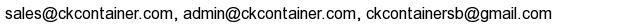Description : Reefer Container Company Particular| Company : | CK Container Sdn Bhd | | Address : | No 25-02 Jalan Setia Tropika 1/30, Taman Setia Tropika Johor Bahru , 81200 Johor, Malaysia | | Email : |  | | Website : | http://ckcontainer.cms6.maxtt.com |